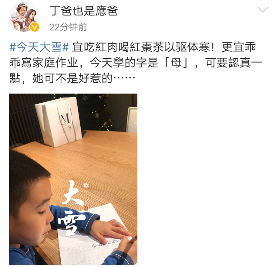 因為和Jasper在一起的時間比較多,所以阿公也時不時地會分享一波Jasper的萌照,文案總是那麼幽默,12月7日,正值大雪節氣,阿公又突然發福利分享了Jasper的近照,並說道:今天大雪,宜吃紅肉、喝紅棗茶以驅體寒!更宜乖乖寫家庭作業,今天學的字是“母”,可要認真一點,她可不是好惹的……